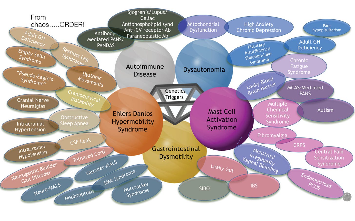 O’Sullivan is confused at how hEDS, POTS, MCAS, Chiari malformations, migraine, IBS, autism and ADHD could all be clustered together in so many of her young patients, and she even says that these patients are ‘a major reason’ she wrote a book arguing that overdiagnosis is making people psychosomatically sick!